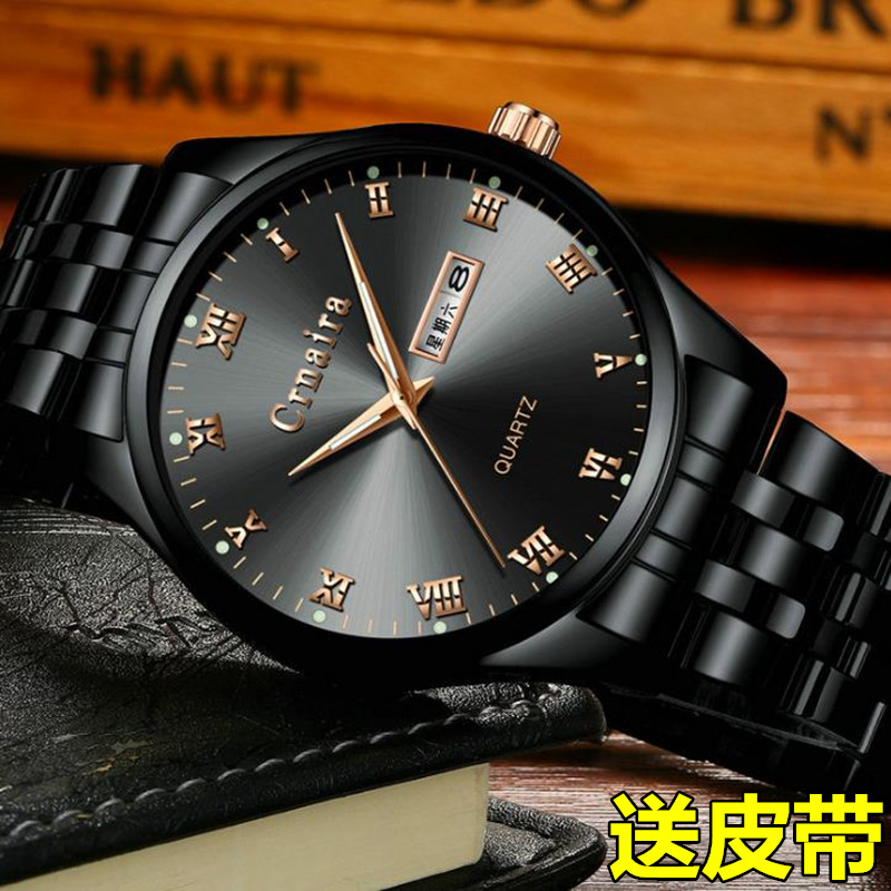 卡奈亚(Crnaira)经典罗马刻度夜光手表男士防水多功能双日历男款石英时尚男表超薄学生腕表星期日期 罗马双日历男神黑钢带黑面+皮表带