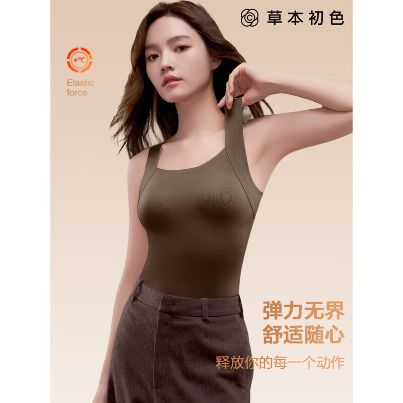 草本初色山茶花保暖背心女秋冬保暖内衣带胸垫秋衣可外穿肌底衣打底衫 耶皮棕 M 【建议85-105斤】