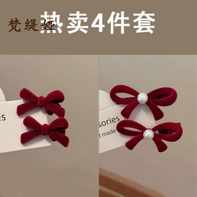 梵缇娅法式复古红色丝绒蝴蝶结头饰少女侧边刘海碎发夹鸭嘴夹子新年发卡 酒红珍珠领结+酒红对夹【4件】