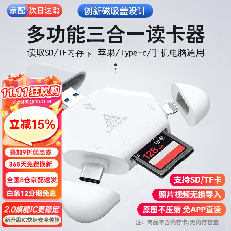 LRUUSI多合一苹果手机读卡器电脑通用相机SD/TF卡 适用华为typec Mac ipad平板 【快速版】苹果/Type-C/电脑 可读SD/TF