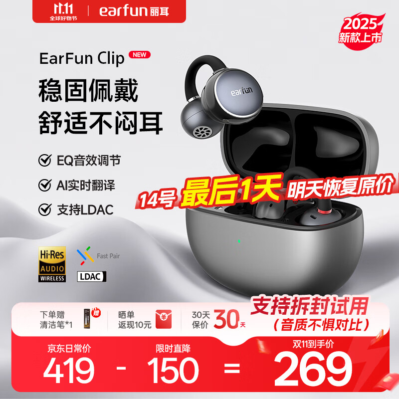 EarFun 丽耳【免费Ai翻译】Clip耳夹式蓝牙耳机骨传导概念蓝牙6.0长续航开放式无线运动音乐跑步防水挂耳耳机 金标认证音质丨免费AI翻译 冷银灰 支持7天试用|18月质保|顺丰闪发