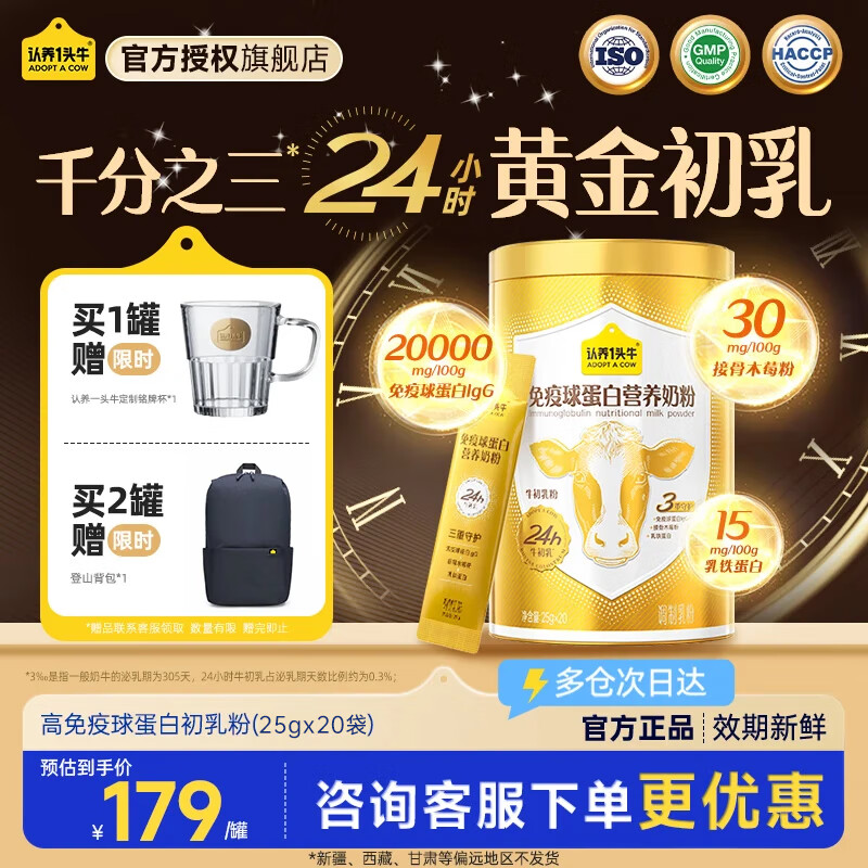 认养一头牛24h黄金牛初乳免疫球蛋白营养高钙成人中老年奶粉新升级送礼 0蔗糖单罐装500g/罐