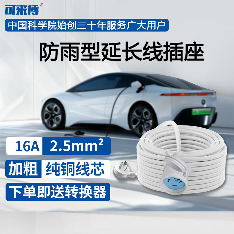 可来博16A充电延长线大功率电源插座新能源汽车充电延长线4000W三相三芯电动车充电插座防雨防冻防摔 加粗纯铜线芯(白色) 20米线2.5平方/16A/4000W