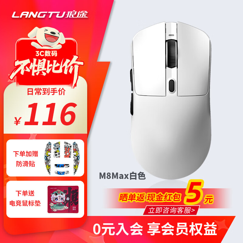狼途M8max无线三模鼠标蓝牙有线PAW3311可充电长续航轻量化人体工学电竞笔记本电脑办公中大手外设鼠标 M8max白色【1000mAh-环诺微动】赠鼠标垫