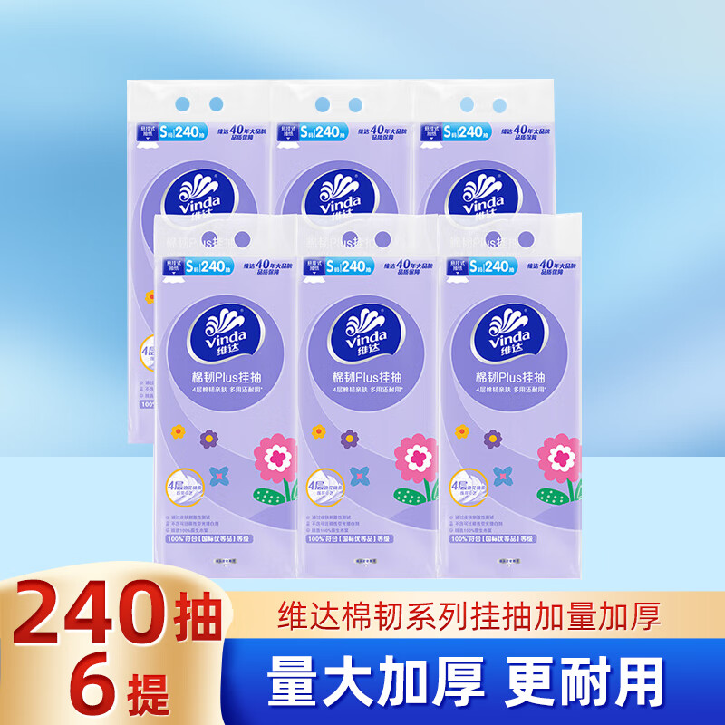 【买3件69.9】维达(Vinda)棉韧悬挂式抽纸 3层240抽*6提